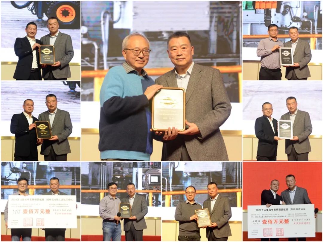 今年年會(huì)的重頭戲是首次頒發(fā)的特別貢獻(xiàn)獎(jiǎng)。今年的創(chuàng)新特別貢獻(xiàn)獎(jiǎng)分別授予了開(kāi)山重工集團(tuán)股份有限公司研究院研制的智能掘進(jìn)鉆車(chē)和開(kāi)山通用機(jī)械研究院研制的低碳?xì)湟睙捁に嚉鋲嚎s機(jī),這兩項(xiàng)科研成果在國(guó)內(nèi)市場(chǎng)創(chuàng)造了較好的經(jīng)濟(jì)效益和社會(huì)效益。集團(tuán)委托上海造幣廠特制的純金獎(jiǎng)牌頒發(fā)給了湯炎博士以及夏劍輝、徐雪峰、惠登峰、田兵兵等四位高級(jí)工程師;另有純銀獎(jiǎng)牌頒發(fā)給了技術(shù)團(tuán)隊(duì)參與兩項(xiàng)創(chuàng)新產(chǎn)品開(kāi)發(fā)的工程技術(shù)人員。