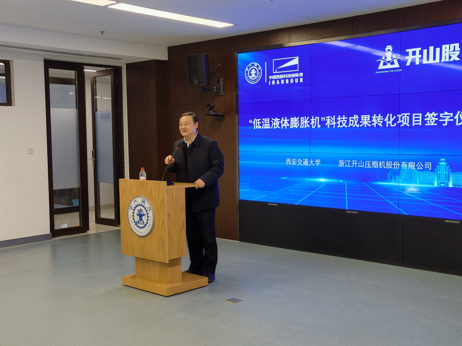 12月23日下午,在西安交通大學(xué)副校長(zhǎng)王鐵軍和浙江開山壓縮機(jī)有限公司董事長(zhǎng)曹克堅(jiān)見證下,西安交大科研院常務(wù)副院長(zhǎng)黃忠德與開山壓縮機(jī)公司副總經(jīng)理?xiàng)罱ㄜ姺謩e代表雙方簽署“低溫液體膨脹機(jī)”科技成果轉(zhuǎn)化項(xiàng)目協(xié)議書。雙方將在西安交大創(chuàng)新港設(shè)立由開山股份控股的創(chuàng)新平臺(tái)公司——開山透平有限公司(KAISHAN TURBOMACHINERY CO.LTD.),旨在研發(fā)包括低溫液體膨脹機(jī)”在內(nèi)的透平機(jī)械產(chǎn)品。